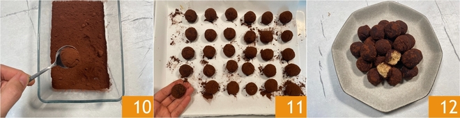 Wenden Sie sie im Kakao, sodass sie gut von allen Seiten bedeckt ist 10, und fahren Sie so fort, bis die gesamte Masse verbraucht ist; mit diesen Mengen erhalten Sie etwa 30 Pralinen. Legen Sie sie nach und nach auf ein Tablett 11 und stellen Sie sie mindestens eine Stunde in den Kühlschrank (oder 20 Minuten ins Gefrierfach), bevor Sie sie servieren. Ihre Tiramisu-Trüffel sind fertig zum Genießen 12!