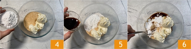 Geben Sie das Keks-Pulver in eine Schüssel, dann fügen Sie den Mascarpone, den Puderzucker 4 und den Kaffee 5 hinzu. Mischen Sie mit einem Löffel 6.