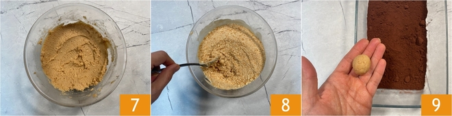 Sie sollten eine homogene Masse erhalten 8. Nehmen Sie nun einen Teelöffel der Masse, etwa 15 g 7, und formen Sie eine Kugel 9.