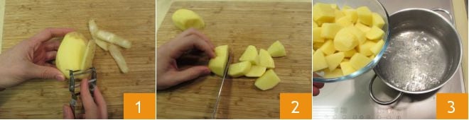 Um das Tiroler Gröstl zuzubereiten, beginnen Sie mit den Kartoffeln. Schälen Sie sie mit einem Sparschäler oder einem kleinen Messer 1 und schneiden Sie sie dann in Stücke von etwa zwei Zentimetern 2. Geben Sie sie in einen Topf mit reichlich kochendem Wasser und kochen Sie sie etwa zwanzig Minuten lang 3.