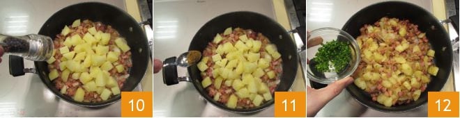 Mit Pfeffer 10 und gemahlenem Kümmel 11 abschmecken, schließlich den gehackten Schnittlauch 12