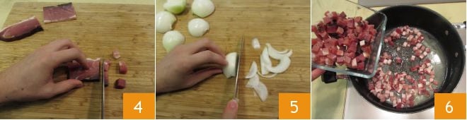 Schneiden Sie in der Zwischenzeit den Speck in Würfel von etwa 1 cm 4. Dann die bereits geschälte Zwiebel fein schneiden 5 und sich zum Herd begeben. Stellen Sie einen Topf auf den Herd und lassen Sie die Butter darin schmelzen. Dann fügen Sie die Würfel des milden Bauchspecks und die Speckwürfel hinzu 6.