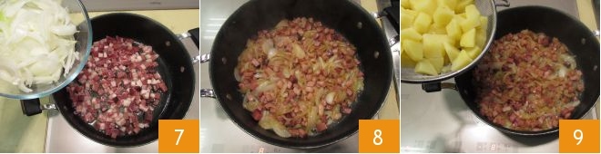 Fügen Sie die Zwiebeln hinzu 7 und lassen Sie alles 15 Minuten bei mittlerer bis hoher Hitze unter gelegentlichem Rühren kochen 8. Nach Ablauf der Zeit sind auch die Kartoffeln gar, also abgießen und in die Sauce geben 9.