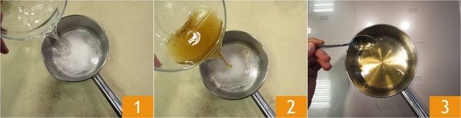 Bereiten Sie zuerst die süß-saure Soße zu. Geben Sie Zucker und Wasser in einen kleinen Topf. Fügen Sie den Apfelessig hinzu 2 und lassen Sie das Ganze bei mittlerer Hitze etwa 10 Minuten reduzieren. Sie sollten eine leicht sirupartige Konsistenz erhalten 3. Beiseite stellen und abkühlen lassen.