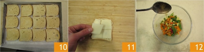 Wenn das Brot geröstet ist, nehmen Sie es aus dem Ofen 10 und legen Sie 4 Scheiben beiseite. Legen Sie den Provolone auf die anderen Scheiben 11 und backen Sie sie erneut für 5 Minuten im Grillmodus bei 200°. Würzen Sie das Gemüse mit der süß-sauren Soße 12.