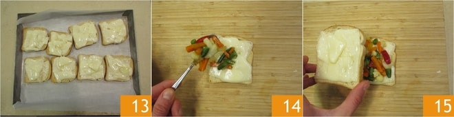 Sobald der Käse vollständig geschmolzen ist, nehmen Sie die Brotscheiben aus dem Ofen 13. Bauen Sie Ihren Toast zusammen: Legen Sie das Gemüse auf eine erste Scheibe Brot mit Käse 14. Decken Sie dann mit einer zweiten Scheibe Brot, ebenfalls mit Käse, ab 15.