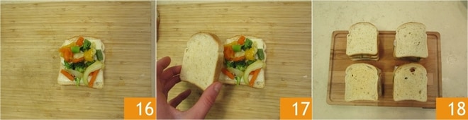 Fügen Sie erneut eine Schicht Gemüse hinzu 16 und beenden Sie mit einer der beiseitegelegten Brotscheiben 17. Fahren Sie auf diese Weise fort, bis Sie Ihre Toasts zubereitet haben 18!