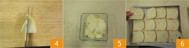 Schneiden Sie den scharfen Provolone in dünne Scheiben 4, entfernen Sie die Rinde und legen Sie ihn beiseite 5. Legen Sie die Toastbrotscheiben auf ein Backblech 6 und rösten Sie sie in einem statischen Ofen bei 200° für 6 Minuten, dann drehen Sie sie um und rösten Sie sie weitere 6 Minuten.