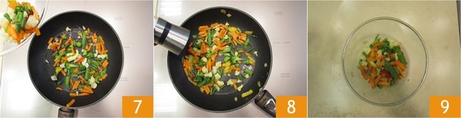 In der Zwischenzeit bereiten Sie das Gemüse vor. Geben Sie es noch gefroren in eine heiße Pfanne mit etwas Öl 7 und braten Sie es etwa 7 Minuten lang an. Zum Schluss salzen 8 und in eine Schüssel geben 9.