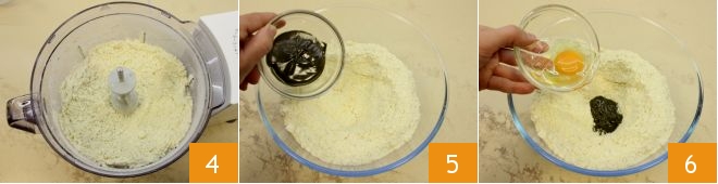 Stellen Sie die Sandmasse her, indem Sie die Messer für einige Sekunden laufen lassen 4. Geben Sie die sandige Mischung in eine Schüssel, fügen Sie die Pistazienpaste 5 und das Ei 6 hinzu.