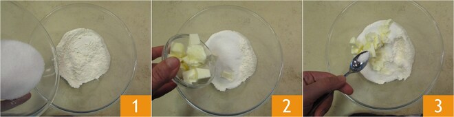 Um die Törtchen mit Skyr-Creme, Birnen und Cashewnüssen zuzubereiten, beginnen Sie mit dem Mürbeteig. Geben Sie Mehl, Zucker 1, kalte Butter 2 und eine Prise Salz 3 in eine Schüssel.