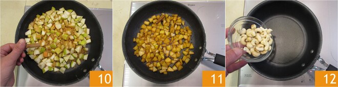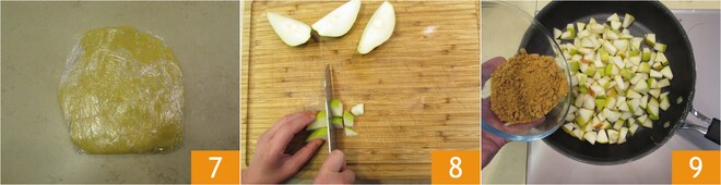 Decken Sie den Teig mit Frischhaltefolie ab 7 und lassen Sie ihn mindestens 30 Minuten im Kühlschrank ruhen. In der Zwischenzeit kümmern Sie sich um die Birnen. Waschen und würfeln Sie die Birnen 8. Geben Sie die Birnen in eine Pfanne, fügen Sie den Zucker 9 hinzu,