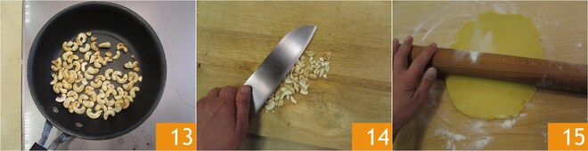 Nachdem sie geröstet sind 13, hacken Sie sie 14. Rollen Sie den Mürbeteig auf eine Dicke von etwa 7-8 mm aus 15.