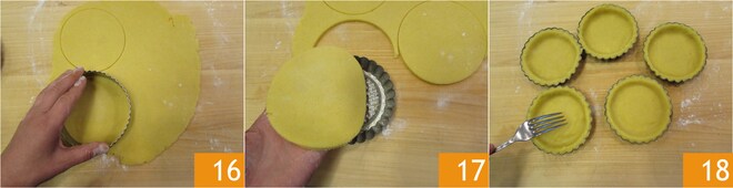 Schneiden Sie Kreise mit einer Form von 11 cm Durchmesser aus 16 und legen Sie die erhaltenen Kreise auf die Törtchenformen mit einem Durchmesser von 10 cm 17. Mit dem restlichen Mürbeteig formen Sie die restlichen Törtchen, so dass 5 Stück entstehen. Stechen Sie mit einer Gabel den Boden der Törtchen ein 18.