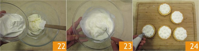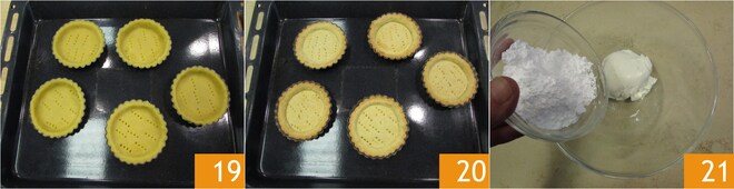 Backen Sie im vorgeheizten Ofen für 20 Minuten bei 180 ° 19. Sobald die Törtchen gebacken sind, lassen Sie sie abkühlen 20. Kümmern Sie sich um die Creme: In einer Schüssel mischen Sie Mascarpone und Puderzucker 21.