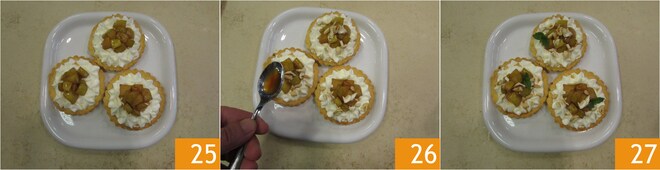 Füllen Sie die Törtchen mit den gekochten Birnen 25, den zerbröselten Cashewnüssen, dem Birnensud und einigen Minzblättern 26. Die Törtchen mit Skyr-Creme, Birnen und Cashewnüssen sind bereit, genossen zu werden 27.