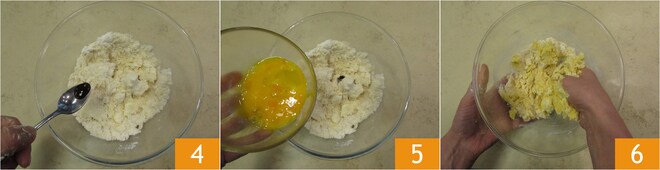 Kneten Sie alles schnell mit den Händen und geben Sie am Ende auch das Vanilleextrakt 4 und das Ei 5 hinzu. Kneten Sie, bis alles gut vermischt ist 6.