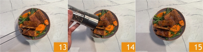 Servieren Sie den Tofu pur oder mit einer Beilage aus saisonalem Gemüse 13 und vervollständigen Sie das Gericht mit fein gehacktem Schnittlauch, Salz und Pfeffer nach Geschmack 14. Ihr Tofu aus der Pfanne ist servierbereit 15!