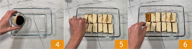 Gießen Sie nun die Sojasauce in eine flache, breite Schale 4 und legen Sie die Scheiben hinein 5, wenden Sie sie auf beiden Seiten 6, sodass sie gewürzt werden, ohne zu stark durchzuweichen.