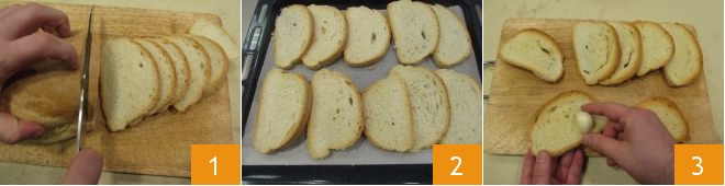 Um die Tomatenbrotsuppe mit Frühlingsgemüse zuzubereiten, beginnen Sie damit, das toskanische Brot in dünne Scheiben zu schneiden 1. Legen Sie die Scheiben auf ein mit Backpapier ausgelegtes Backblech, ohne sie zu überlappen 2. Backen Sie sie bei 200 °C für 5/7 Minuten. Sobald Sie aus dem Ofen genommen sind, lassen Sie sie abkühlen. Sobald die Brotscheiben abgekühlt sind, reiben Sie geschälte Knoblauchzehen darauf 3.