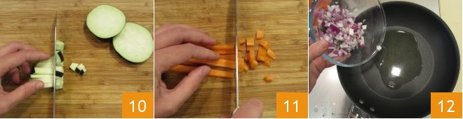 und Auberginen 10. Schälen Sie die Karotten und schneiden Sie sie ebenfalls in Würfel 11. Erhitzen Sie das Olivenöl in einem Topf, geben Sie dann die gehackten Zwiebeln hinein 12, braten Sie sie etwa 3 Minuten an, dann fügen Sie nach und nach das gesamte Gemüse je nach benötigter Garzeit hinzu.