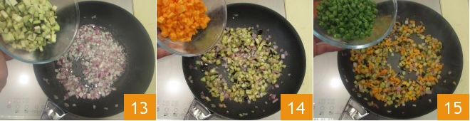 Geben Sie zuerst die Auberginen hinzu 13, schmoren Sie sie 3 Minuten, fügen Sie dann die Karotten hinzu 14 und nach weiteren 3 Minuten die Bohnen 15