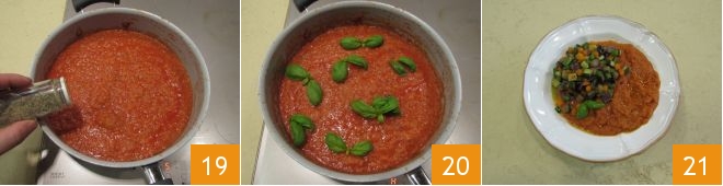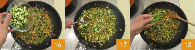 und zuletzt die Zucchini 16. Setzen Sie das Kochen bei mittlerer Hitze weitere 10 Minuten fort. Sobald sie fertig sind, würzen Sie sie mit dem Chilipulver 17 und verleihen Sie ihnen Duft mit frischen Basilikumblättern 18.
