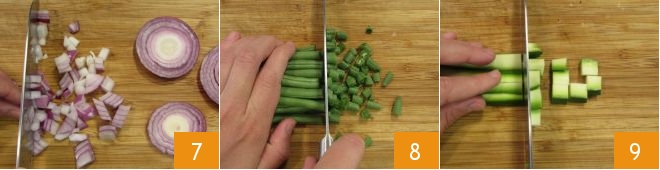 Kümmern Sie sich inzwischen um das Gemüse: Schälen Sie die rote Zwiebel und hacken Sie sie 7, waschen und schneiden Sie die Bohnen und zerkleinern Sie sie in kleine Würfel von etwa einem halben cm 8, verfahren Sie ebenso mit den Zucchini 9