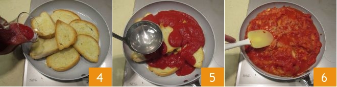 Nehmen Sie nun eine beschichtete Pfanne mit hohem Rand und legen Sie das geröstete Brot hinein. Gießen Sie die Tomatenpassata 4 und das Wasser 5 darüber, sodass die Brotscheiben vollständig mit Flüssigkeit bedeckt sind. Rühren Sie um und kochen Sie bei schwacher Hitze 40-50 Minuten, um die Flüssigkeit verdampfen zu lassen. Rühren Sie oft, um eine gleichmäßige Garung zu erreichen und das Brot in Brei zu verwandeln, salzen und pfeffern Sie.