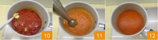 Nach der Zeit entfernen Sie das Basilikum und den Knoblauch 10, dann pürieren Sie die Tomaten mit einem Stabmixer, um eine glatte Creme zu erhalten 11. Lassen Sie sie noch 25-30 Minuten weiterkochen, damit sie etwas eindickt und reduziert 12; dann schalten Sie die Hitze aus und lassen Sie sie bei Raumtemperatur abkühlen.