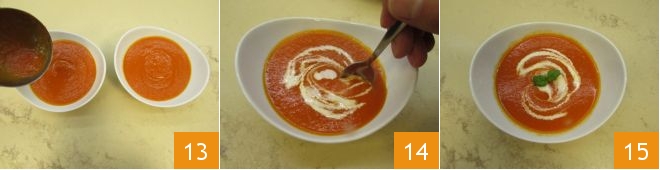 An diesem Punkt wird Ihre Tomatensuppe fertig sein, wir haben uns entschieden, sie in kleinen Schalen zu servieren 13 und mit frischer Sahne zu garnieren. Wenn Sie das auch tun möchten, ist es ganz einfach, Sie müssen nur ein wenig Sahne auf die Suppe gießen und mit einem Löffel eine Spirale formen 14. Geben Sie Ihrer Tomatensuppe schließlich einen Hauch mehr Farbe und Duft, indem Sie ein Basilikumblatt hinzufügen und servieren 15.