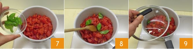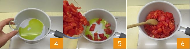 Erhitzen Sie in einem Topf das Olivenöl zusammen mit einer geschälten Knoblauchzehe 4, nach einer Minute fügen Sie die Tomaten hinzu 5 und rühren Sie um, um sie für einige Minuten zu würzen 6.