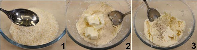 Um die Tomatensnacks mit gegrillten Zucchini und Parmesansahne zuzubereiten, beginnen Sie mit der Sahne: Geben Sie den geriebenen Parmesan in eine Schüssel und fügen Sie einen Esslöffel Weißwein hinzu 1, die in Stücke geschnittene und bei Raumtemperatur erweichte Butter 2 und den Pfeffer 3.
