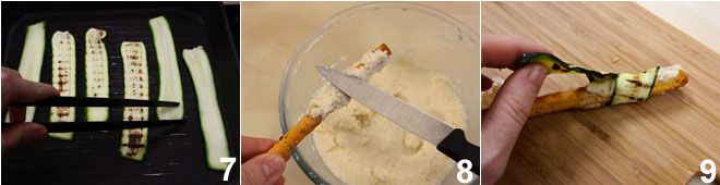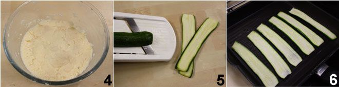 Mischen Sie gut, um die Zutaten zu verbinden, bis eine kompakte Sahne entsteht 4 (bei Bedarf mehr Weißwein hinzufügen). In der Zwischenzeit waschen, trocknen und schneiden Sie die Zucchini mit Hilfe eines Hobels in 12 Scheiben 5. Legen Sie die Zucchini auf eine Platte 6,