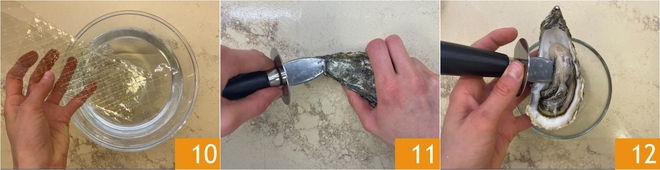 Kommen wir nun zu den Austern: Zuerst die Gelatineblätter in kaltem Wasser einweichen 10. Öffnen Sie die Austern mit dem speziellen Messer 11 und achten Sie darauf, Handschuhe oder ein Tuch zum Schutz der Hände zu verwenden, dann entnehmen Sie das Weichtier 12.