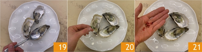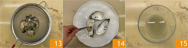 Das Austernwasser filtern 13. Legen Sie die Weichtiere wieder in die Schalen 14, nachdem Sie diese gründlich gereinigt und den Teil entfernt haben, der das Weichtier mit der Schale verbindet. Bewahren Sie 60 g Austernwasser für das Gelee 15 und ein paar Esslöffel für das Tomatentatar auf.