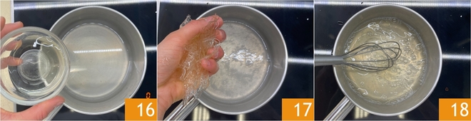 Gießen Sie nun die 60 g Austernwasser in einen Topf, fügen Sie den Wermut hinzu 16 und bringen Sie ihn fast zum Kochen. Wenn er fast kocht, schalten Sie die Hitze aus und geben Sie die abgetropfte und gut ausgedrückte Gelatine hinzu 17, dann rühren Sie mit einem Schneebesen, um sie vollständig aufzulösen 18.