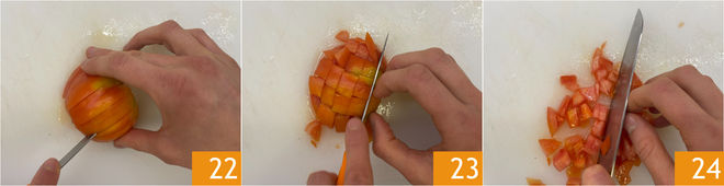 In der Zwischenzeit widmen Sie sich dem Tomatentatar: Schneiden Sie die Tomate zuerst in Scheiben 22 und dann in Würfel 23. Schließlich hacken Sie sie mit dem Messer 24.