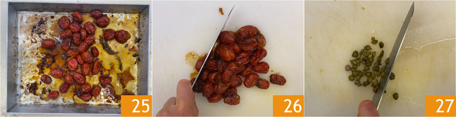 Nehmen Sie die confierten Kirschtomaten, die inzwischen gekocht sein sollten 25, und hacken Sie sie ebenfalls fein 26. Entsalzen und hacken Sie die Kapern 27.