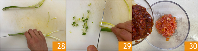 Entfernen Sie den grünen Teil der Frühlingszwiebel, teilen Sie sie der Länge nach 28 und schneiden Sie sie in dünne Scheiben 29. In einer Schüssel vermischen Sie das frische Tomatentatar mit dem confierten Kirschtomatentatar 30.