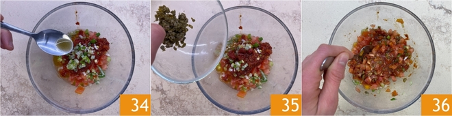 Zum Schluss würzen Sie mit grünem Tabasco 34 und den Kapern 35 und passen die Menge je nach Salzgehalt der Mischung an. Gut mischen, um alles zu kombinieren 36.