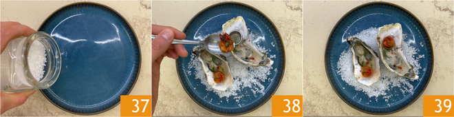 Sie sind bereit zum Anrichten: Erstellen Sie ein Bett aus grobem Salz am Boden des Tellers 37, dann legen Sie 2 Austern darauf 38; so bleiben sie fest. Verwenden Sie einen kleinen Ring, um das Tatar neben dem Gelee in jeder Schale hinzuzufügen 38; Sie können die Mengen variieren, um verschiedene Geschmackserlebnisse zu schaffen. Ihr Tomatentatar in zwei Konsistenzen mit Austerngelee ist bereit zum Servieren 39!