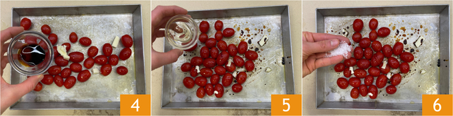 Um das Tomatentatar in zwei Konsistenzen mit Austerngelee zuzubereiten, beginnen Sie mit der Vorbereitung der confierten Kirschtomaten: Geben Sie die ganzen Kirschtomaten in eine Backform 1, dann würzen Sie mit Öl 2 und Butter 3.