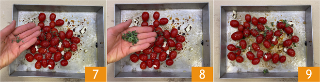 Zum Schluss aromatisieren Sie mit den Thymianblättchen 7 und Majoran 8. Schütteln Sie die Form, um die Würze gut zu verteilen, dann im statischen Ofen bei 160°C etwa 2,5 Stunden backen 9.