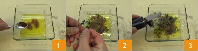 Um den Tomino-Burger zuzubereiten, kümmern Sie sich zuerst um das Marinieren der Tomini: Geben Sie in eine Schüssel das Öl und aromatisieren Sie es mit dem Chili 1, dem Thymian 2 und dem gepressten Knoblauch 3 (alternativ können Sie die ganze, geschälte Knoblauchzehe verwenden und nach dem Marinieren entfernen).