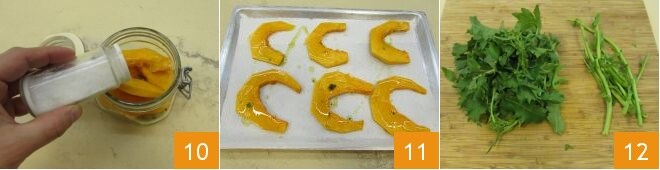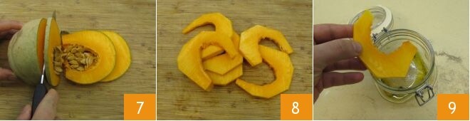 In der Zwischenzeit reinigen Sie den Kürbis und schneiden ihn in Scheiben von etwa einem halben Zentimeter (7-8): Die Menge des gereinigten Kürbisses beträgt 150 g. Nachdem Sie die Tomini aus dem Glas genommen haben, geben Sie die Kürbisscheiben hinein 9, um sie mit derselben Marinade zu würzen,