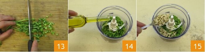 Schneiden Sie die Stiele fein 13 und geben Sie sie in die Schüssel des Mixers, fügen Sie etwa 10 g Öl hinzu 14, das Salz, die Pinienkerne 15