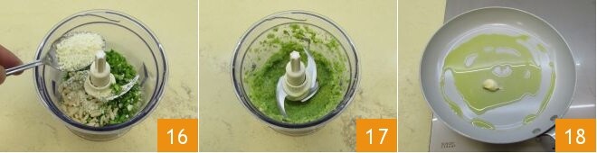 und den geriebenen Parmesan 16. Mixen Sie alles, um ein homogenes Pesto zu erhalten 17. Fahren Sie mit dem Kochen der Blätter fort: Erhitzen Sie einen Schuss Öl in einer Pfanne mit einer angedrückten Knoblauchzehe 18;