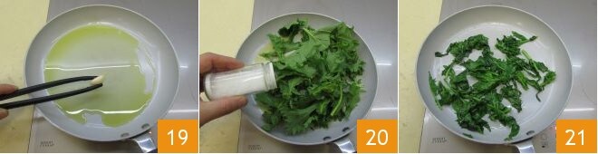 sobald das Öl aromatisiert ist, entfernen Sie den Knoblauch 19 und fügen die Blätter hinzu, salzen Sie 20 und braten Sie sie bei starker Hitze etwa 5 Minuten an, dann stellen Sie sie beiseite 21.