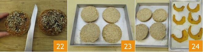 Nehmen Sie die Burger-Brötchen und halbieren Sie sie 22, legen Sie sie auf ein Backblech, mit der geschnittenen Seite nach oben 23, und erwärmen Sie sie im Ofen 2 Minuten vor Ende der Kürbisgarzeit. Die Brötchen und der Kürbis sind fertig 24, jetzt können Sie sich um die Tomini kümmern: